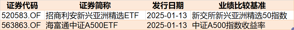有2只ETF披露下周发行,跟踪标的为新兴亚洲精选50和中证A500指数。