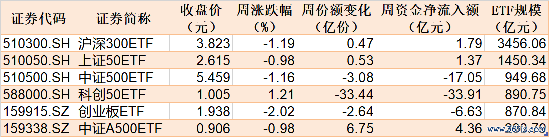 本周市场主要股指涨跌互现,6只主要指数ETF中,创业板ETF跌超2%,科创50ETF涨逾1%。。
