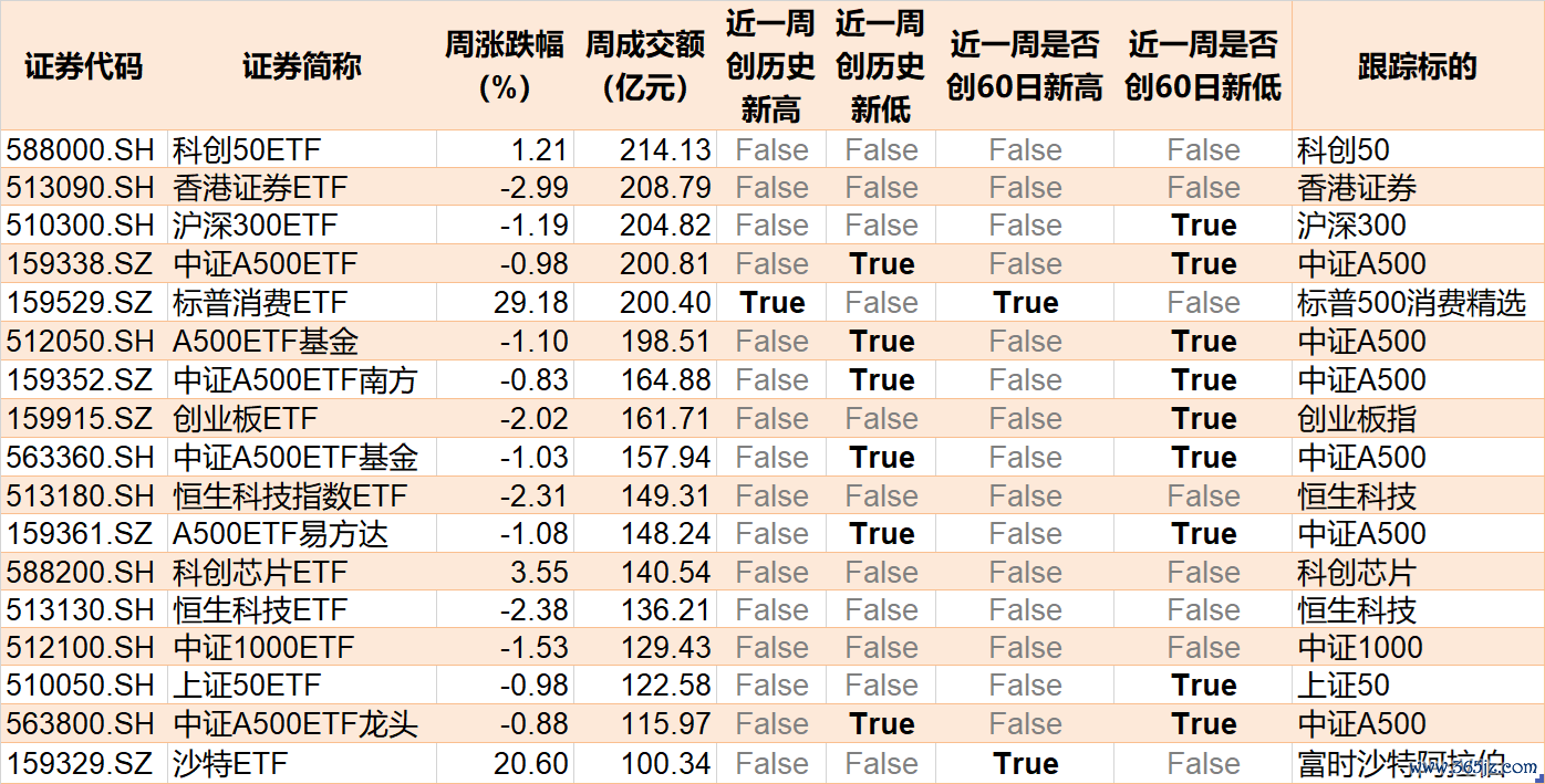 从单个ETF来看,科创50ETF、香港证券ETF、沪深300ETF、中证A500ETF、标普消费ETF周成交额超200亿元。
