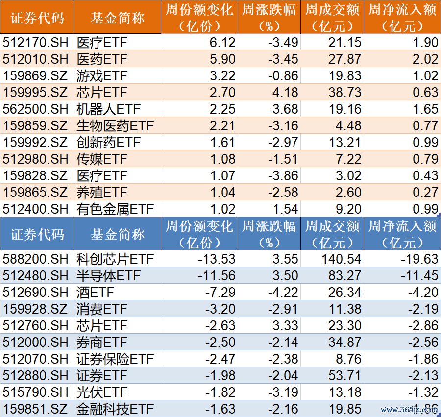 行业主题上看,医疗、医药相关ETF被资金看好,而科创芯片、半导体相关ETF被资金抛售。