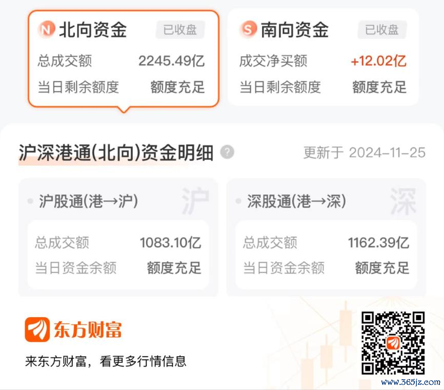 11月25日,两市全天震荡,三大指数微幅收跌。北向资金当日成交2245.49亿元,占沪深两市总成交额的15.07%。